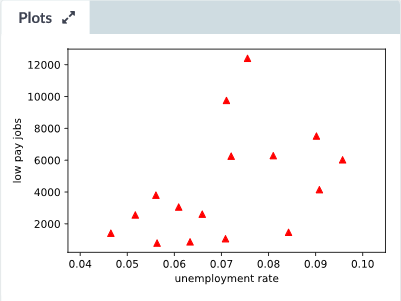 The default settings for matplotlib may not be what you hope to present to others, so you decide to customize your plot for low wages versus unemployment rate.